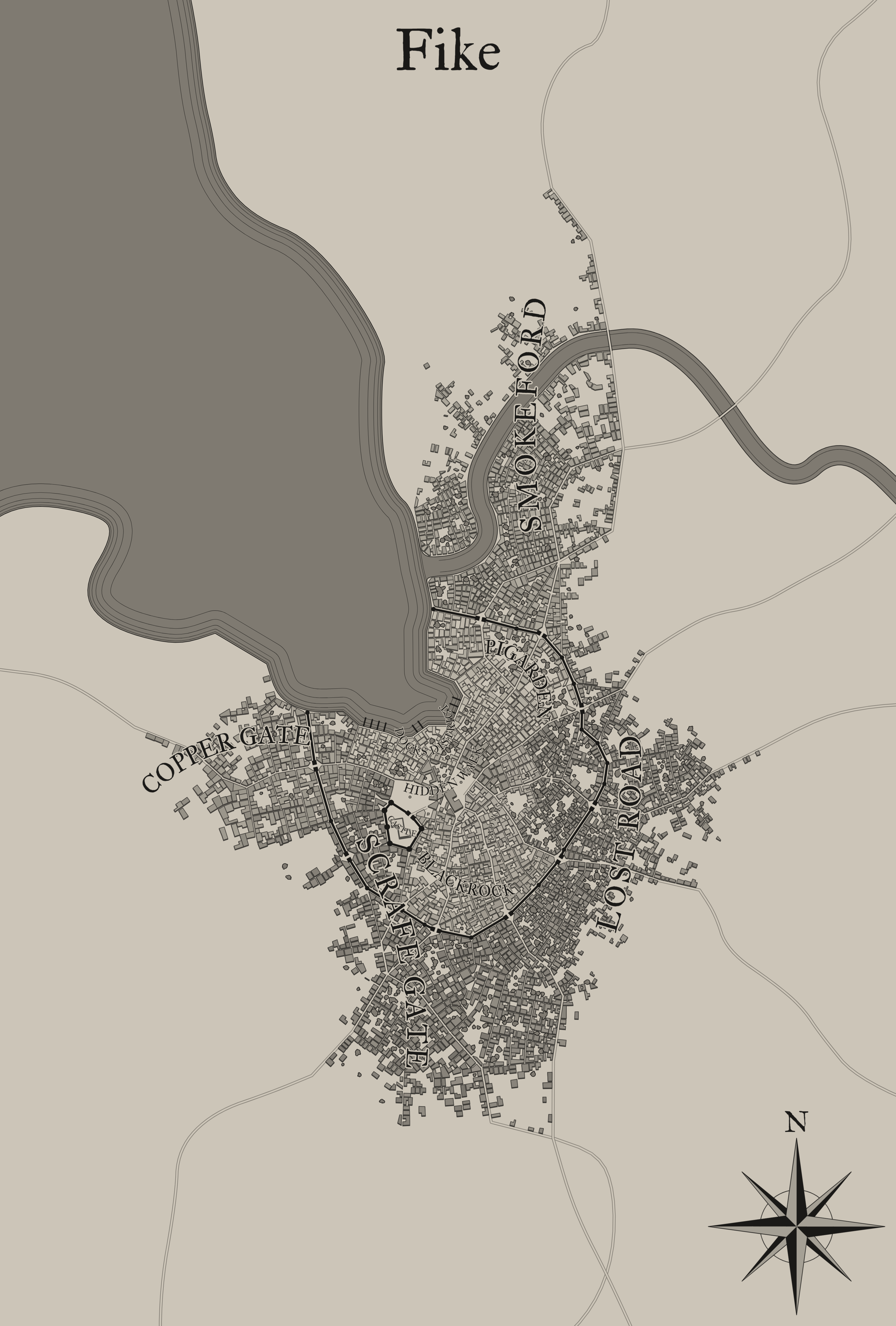 Surrounded by hilly farmland, Fike is the most populated of the north-eastern cities. Located on the most fertile ground of The Ward, it is the producer of fresh produce for itself and its sister city of Often. Its abundance is largely due to this hills surrounding the city which bear a great deal of the force from Greatwinds. However its abundant resources also make it a frequent target of its rival city, Hoss.