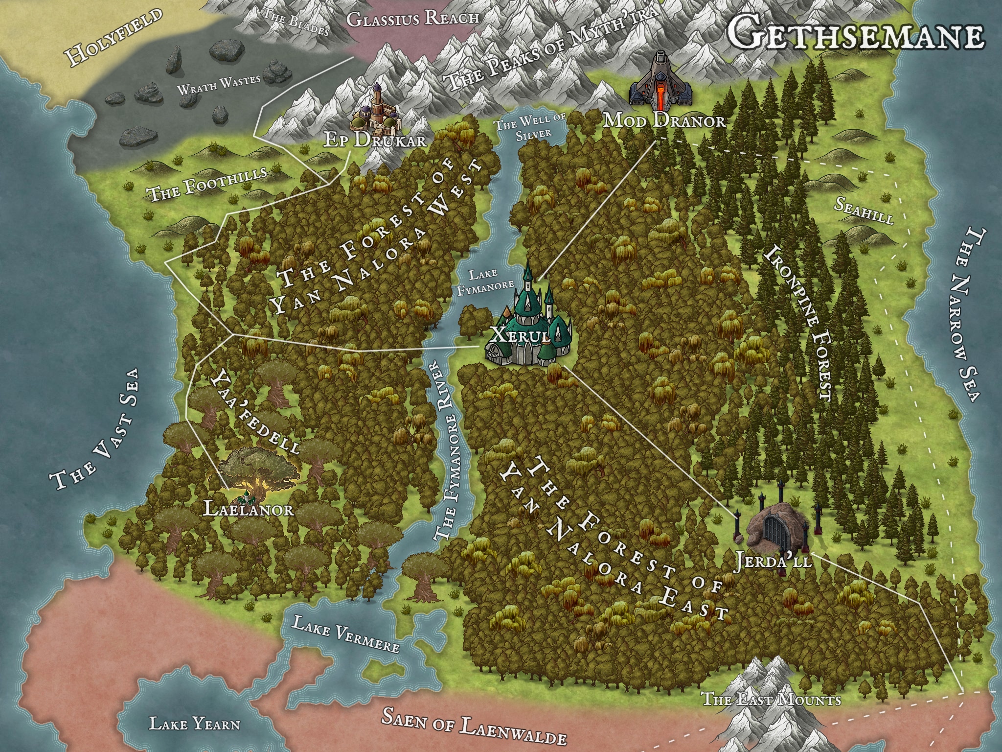 Gethsemane is a lush and beautiful land. It’s dominated largely by The Forest of Yan Nalora. A wood of massive trees, crystal streams, as well as strange and dangerous creatures. Tucked into the north are its two mountain cities. The peak city of Ep Drukar, and the subterranean city of Mod Dranor. These cities are located in The Peaks of Myth’ira, a grand and perilous range of mountains overlook the garden kingdom.