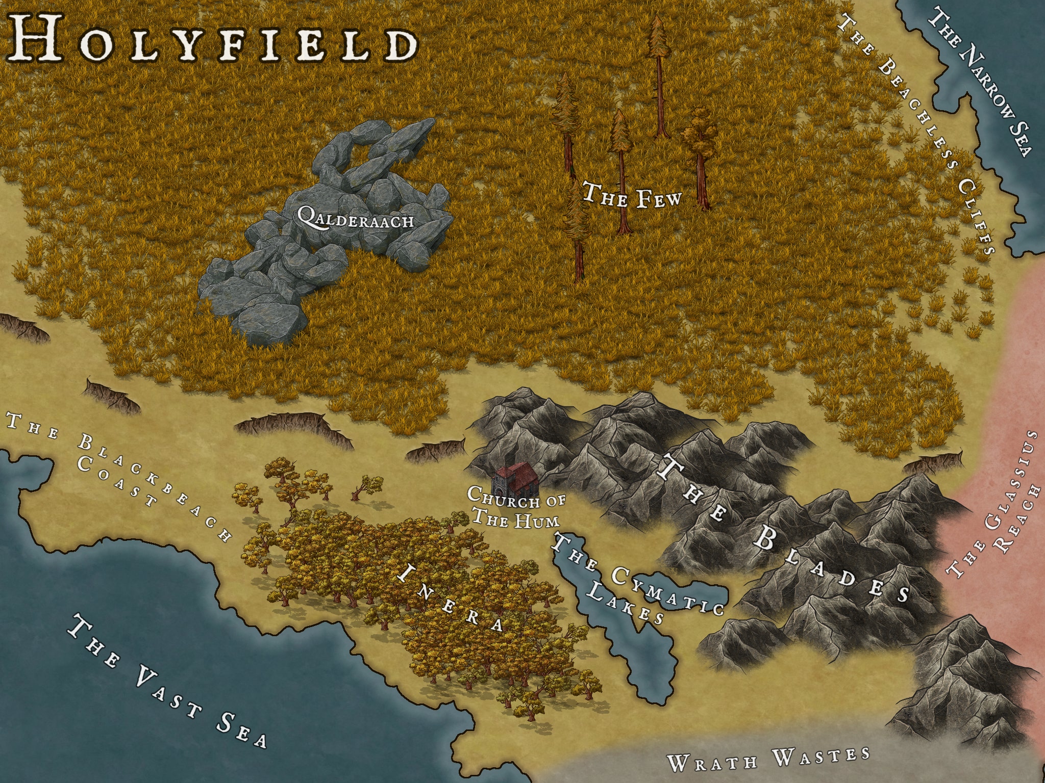The Sacred Land, The First Corner. Holyfield is a region held high in some teachings of Zol’s Religions. In these teachings, it is thought to be the first place where The Watcher in The Door began creating the world. Academics will tell you there is no real evidence of this, however the region possesses strange, and unique natural tendencies. Those who go there will also tell you there is an undefinable, gripping emotion that is associated within being in this place. A haunted feeling of beauty, awe, fear, and reverence. Something deep within ones gut they tells them they are not worthy of this place. These strange natural tendencies are known as The Hum, and are most present as a mysterious musical humming 1/3rd of people can hear.
