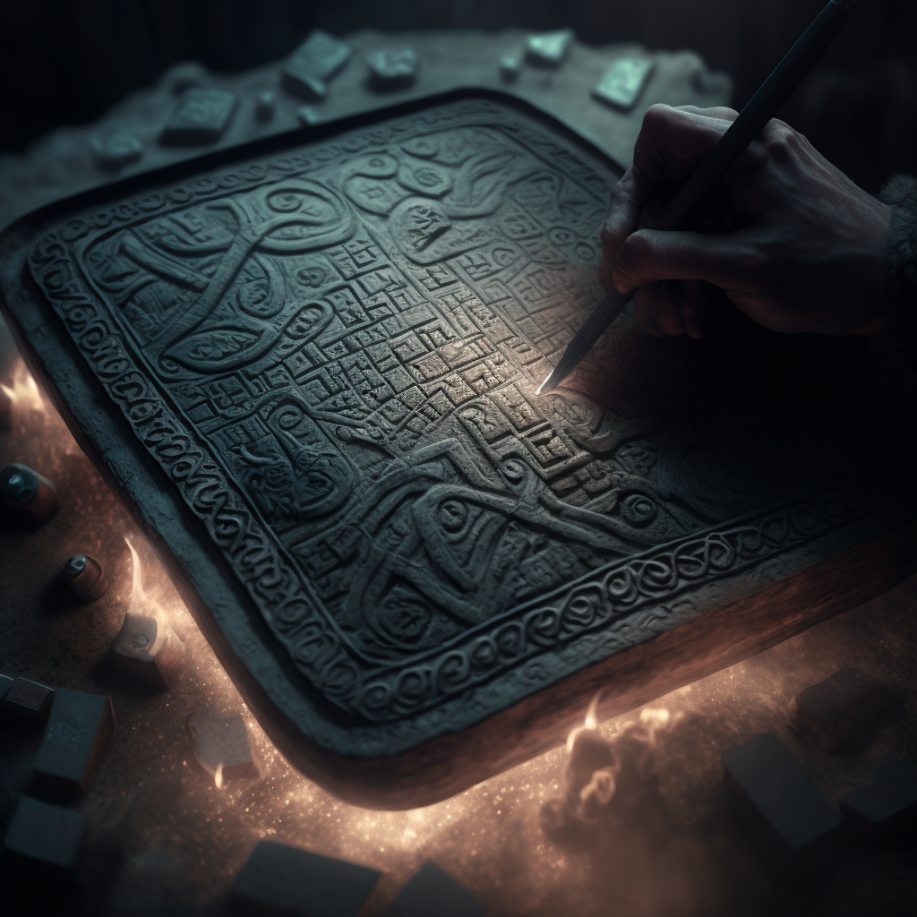 An artificer carving complex Ferric Alphabet runes into an iron slab, its design hidden amongst artistic additions to obfuscate its method of function. A process known as Ferrication