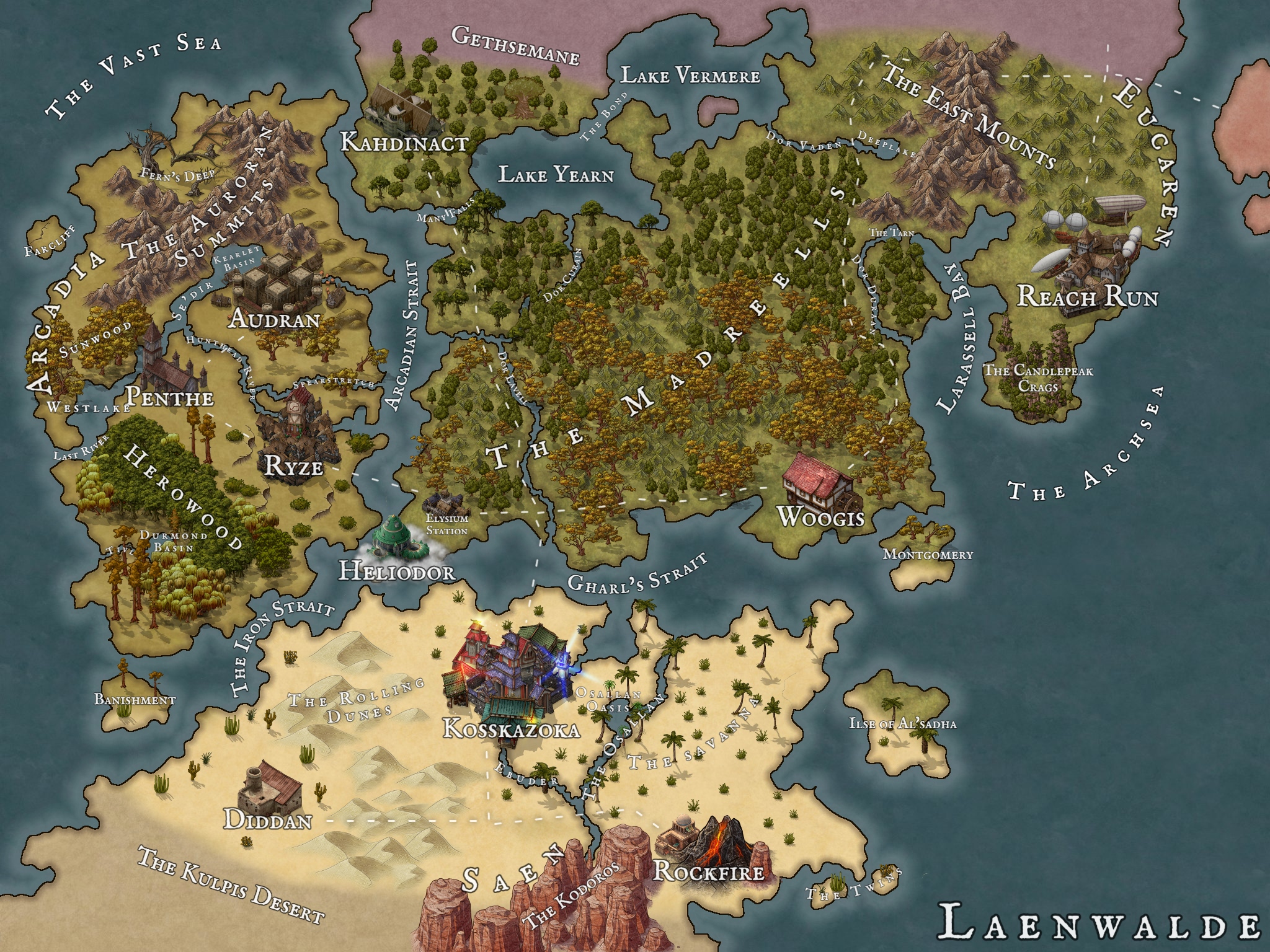 The Unified Kingdoms of the West. The largest political power in all of Zol. Laenwalde is a kingdom formed of the island of Arcadia, the green hills of Eucaren, and the flowing sands of Saen. These three regions are bound by code, trade, and military ties. However their citizens do not necessarily see their neighboring regions as friends.