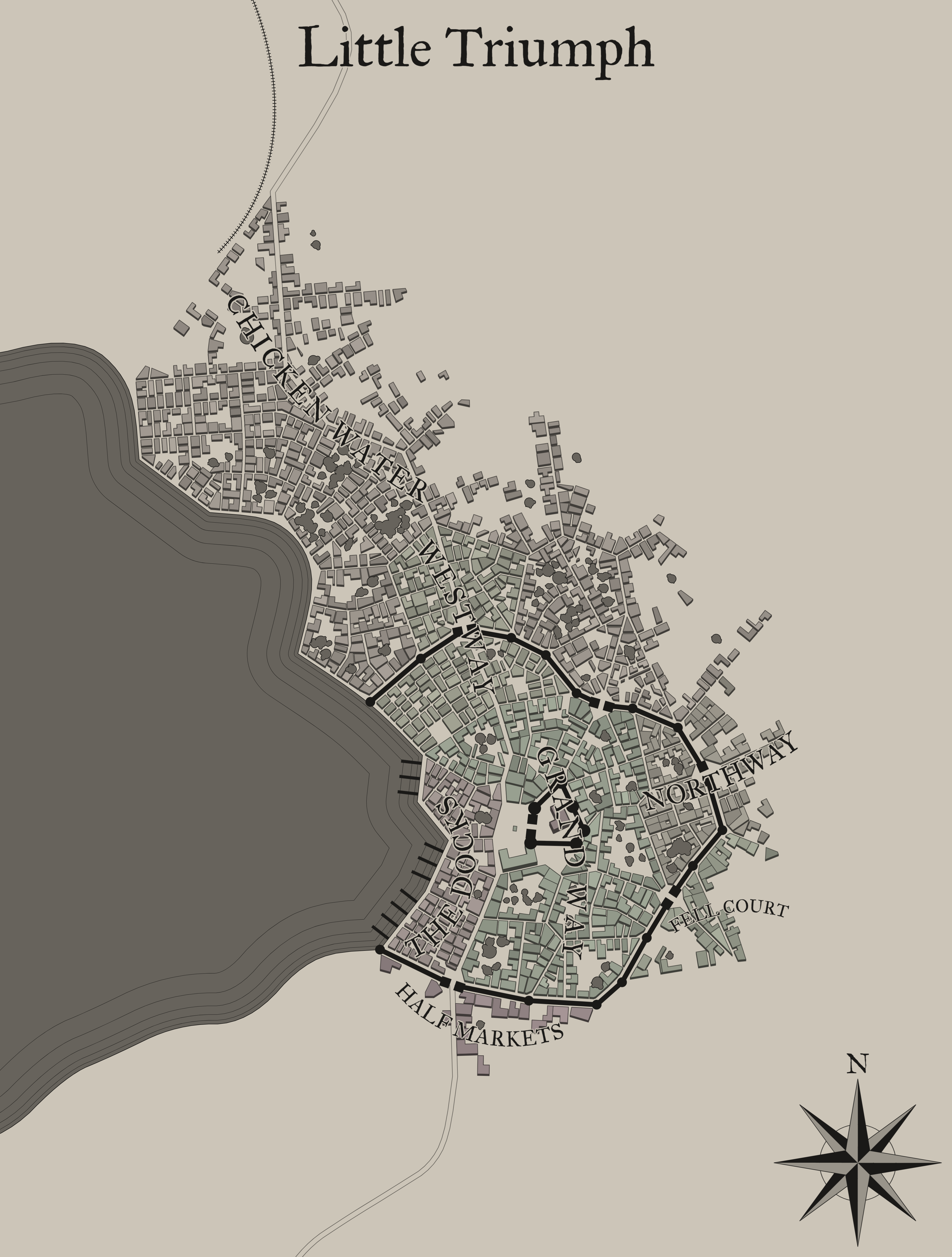 They city was originally an outpost, called Triumph, placed for the purpose of expansion during the lulls of the Triumvirate Battles. Many of these outposts were constructed on the furthest edges of The Witchlands. All of these outposts quickly fell to monsters, save for Triumph. Despite regular attacks, disease, and even curses, a small city formed around the outpost.