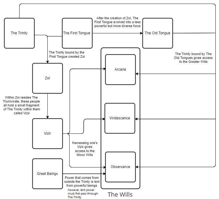 Magic in Zol emanates from The Trinity from its metaphysical source within the Prime Material Plane. It manifests in 3 ways called The Wills.