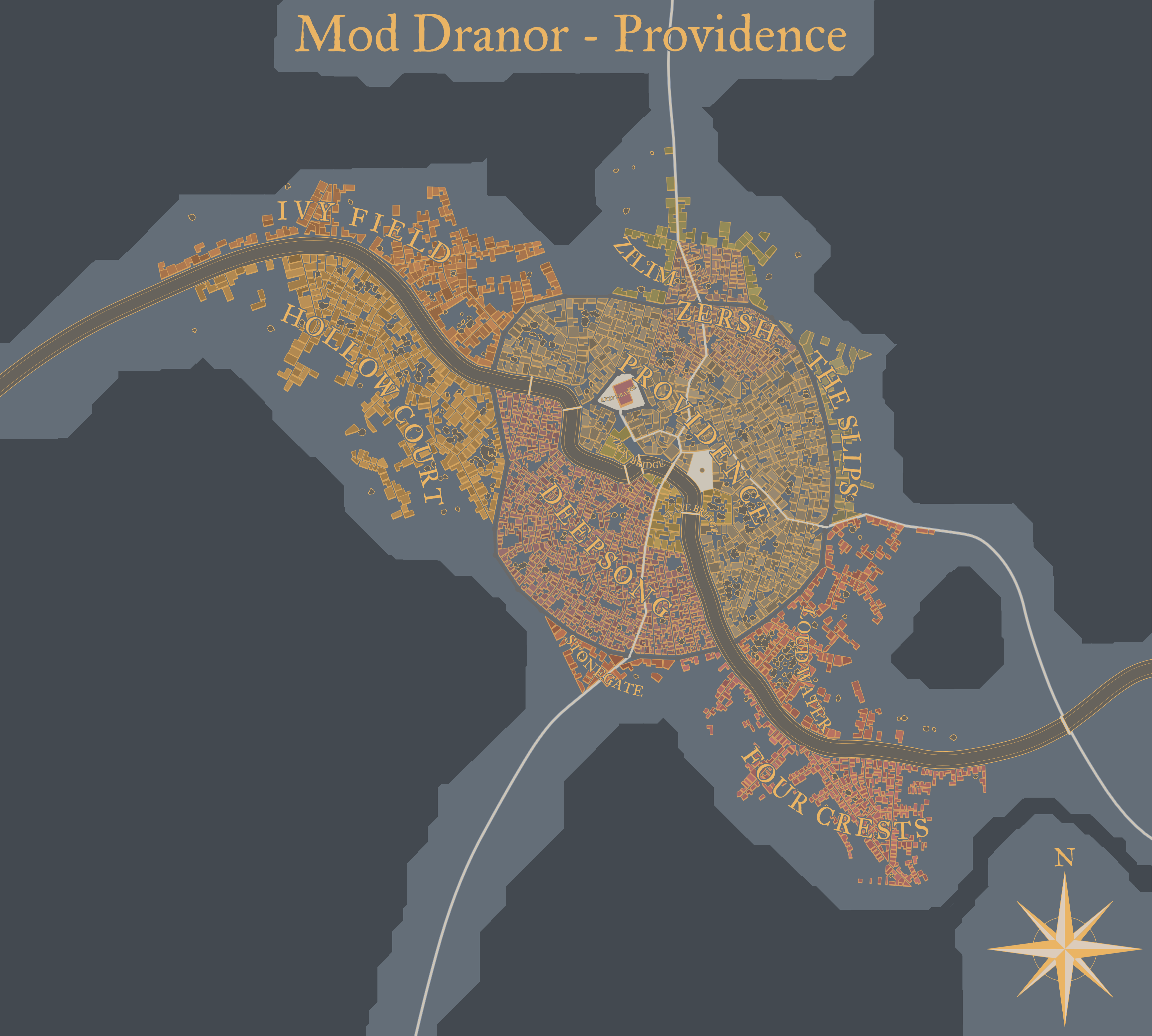 Providence - The central sub-city of Dwarven Honor. At its entrance lies the Great Stone Door, the main entrance to the city. At the center of Providence lies the beautiful palace of Keep Dranor. Its north road leads to Timber Forge, its east road leads to Watchers Crest, and its south road leads to The Great Stone Door