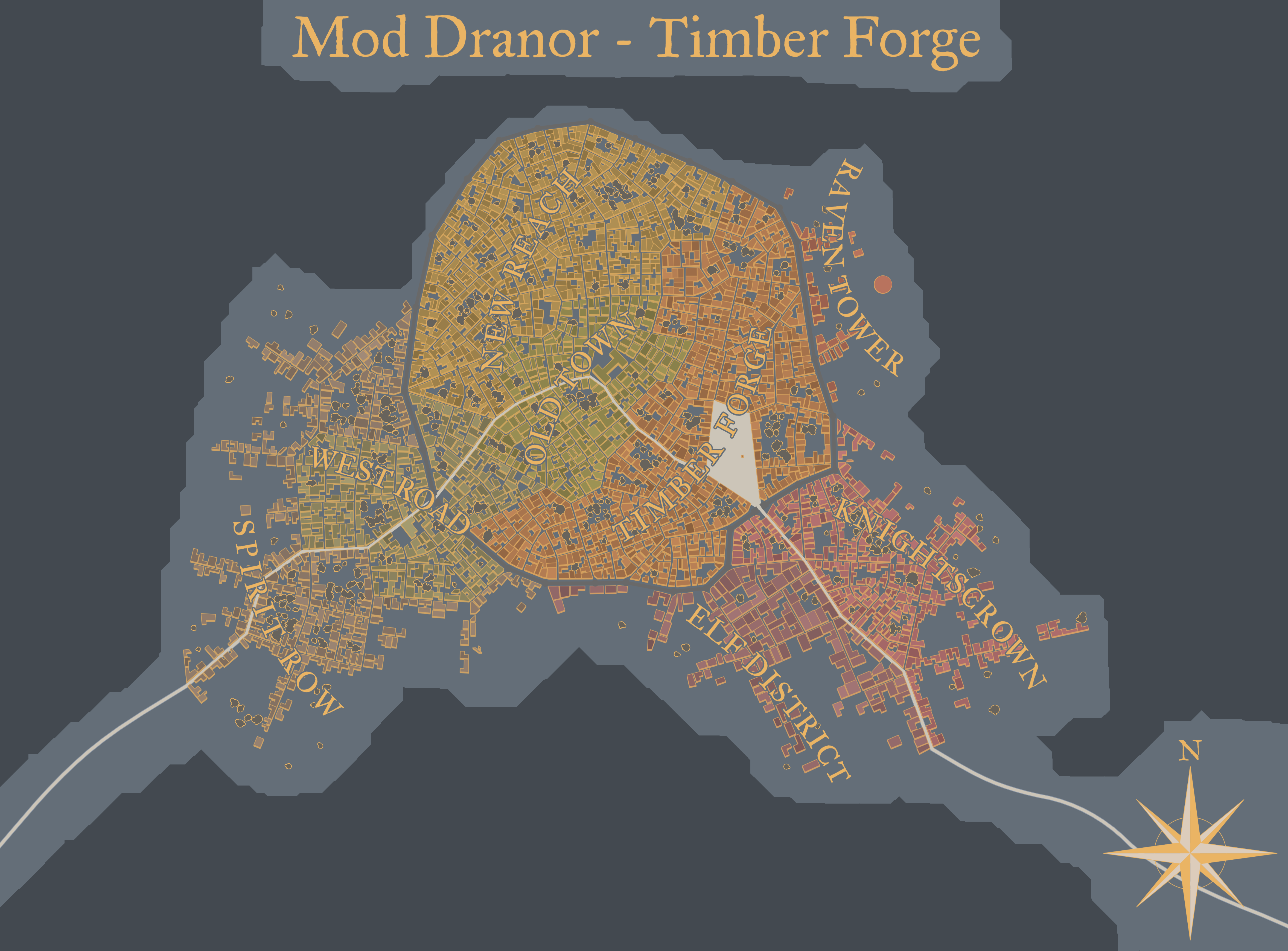 Timber Forge - The sub-city of dwarven craft. Timber Forge is not directly attached to the city’s main entrance, but it is the closest to the surface. This is because of the Raven Tower. A large structure that spans from the cavern’s floor to the ceiling, with a large lift in it’s center. The Raven Tower serves the purpose of moving resources from the surface down into the city. Most notably timber and agricultural goods.