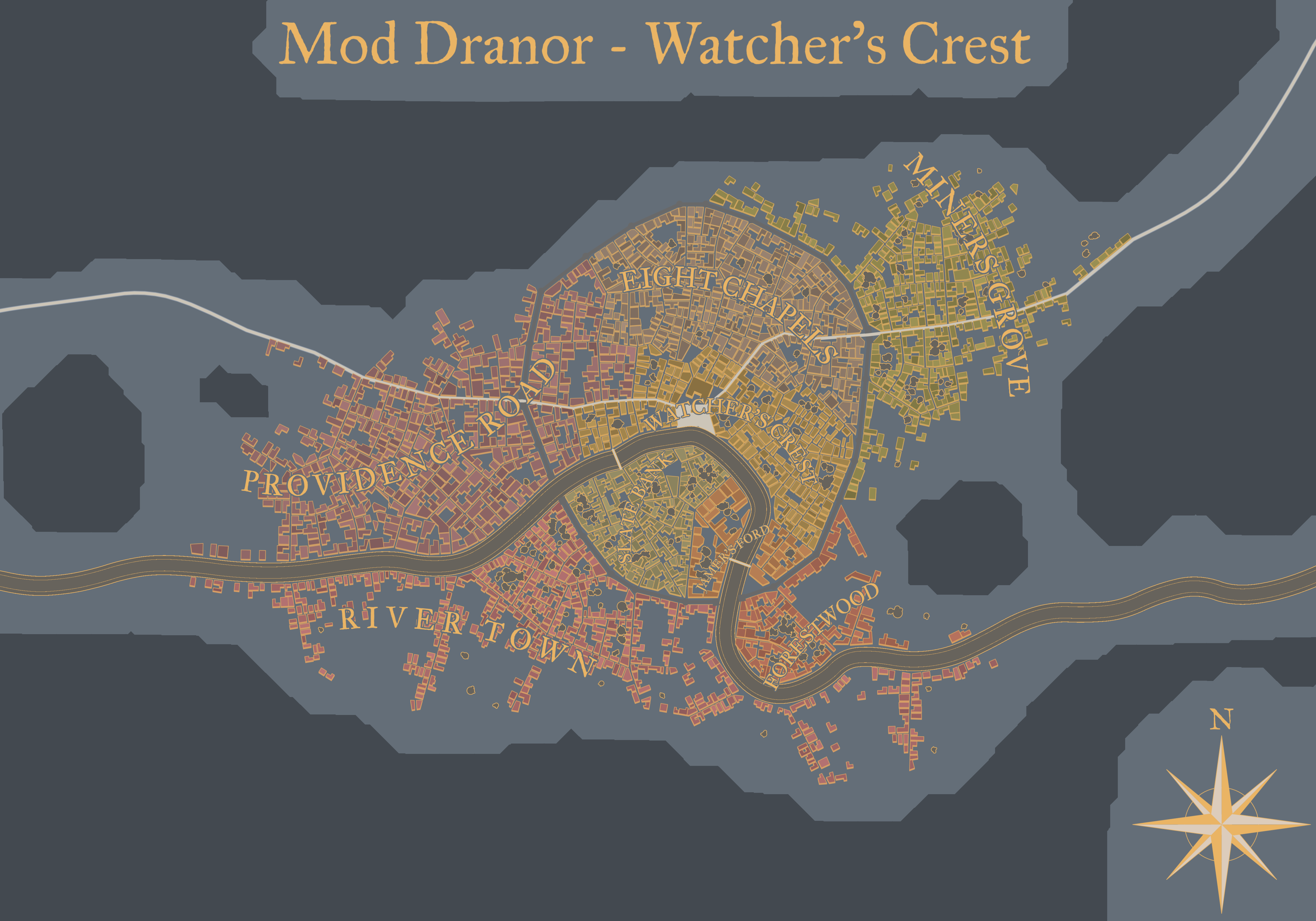 Watcher’s Crest - The deepest part of Mad Dranor. This section of city does not allow outsiders, as its grounds are considered to be holy amongst dwarves as it was the first place Mythril was discovered. It is also where most of the city’s mining operations are based.
