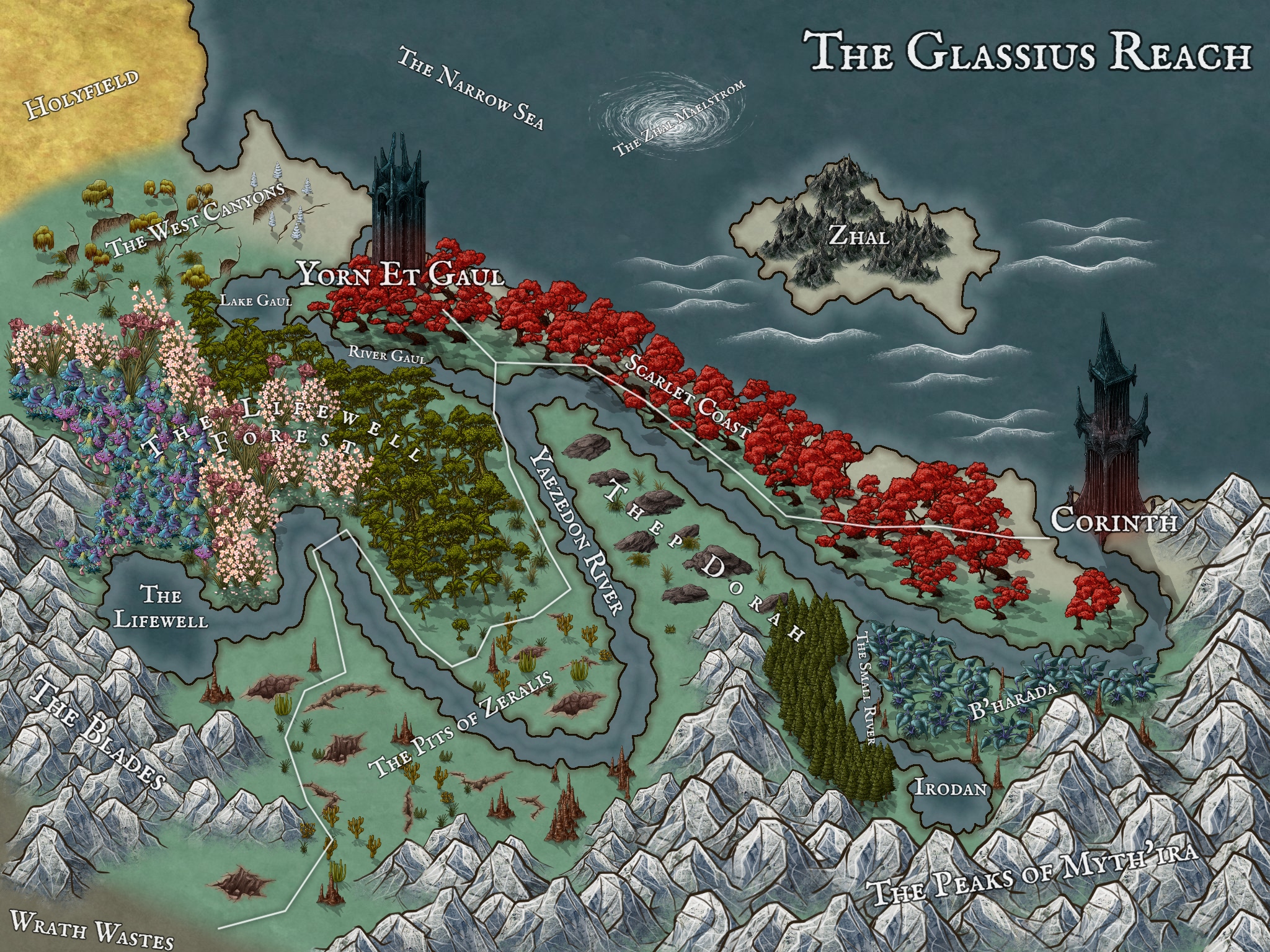 Geographically and politically isolated, The Reach is cut off from the rest of the world by The Peaks of Myth’ira and the treacherous Wrath Wastes. The Glassius Reach is the most alien of the kingdoms within The Three Corners. Both its wilderness, and its people are unlike any other. Inhabited by Changelings, and scorned by all of Zol, the Reach holds many mysteries.