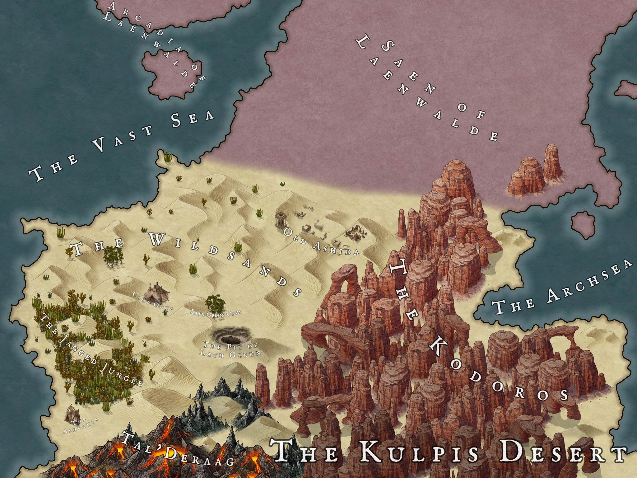 Not much is known of The Kulpis Desert due to its harsh environment and lack of resources. Those who live there are gruff bandits who hate the outside world, or native groups that live simplistic lifestyles.