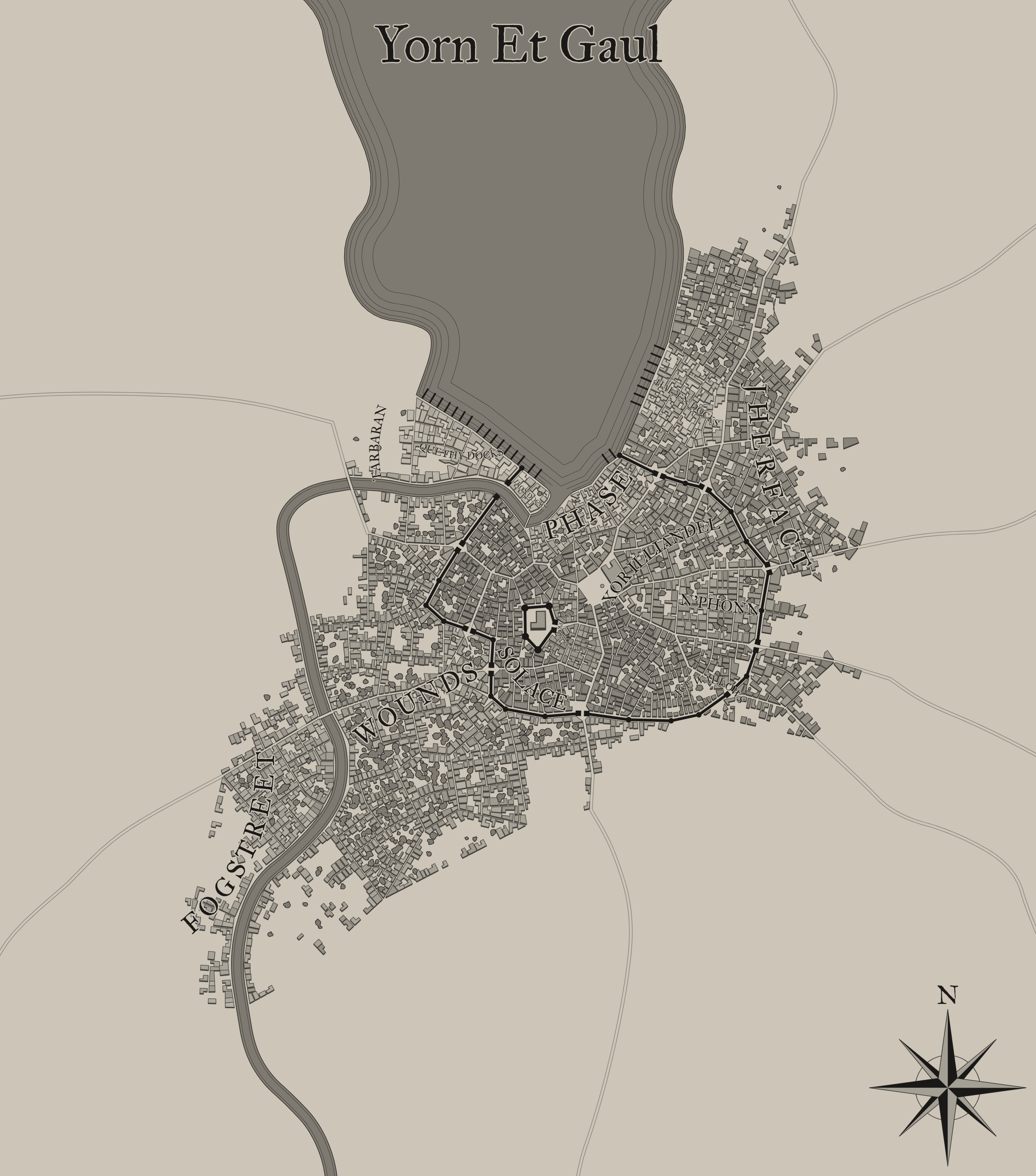 The city is overlooked by Shard Witness Yemodhan Surrite. Surrite is commonly mocked as one of The Unwitnessed, a term used for rulers of Yorn et Gaul since the Western War and the loss of The Apex. Despite the city turmoil, Shard Witness Surrite has had a reasonable amount of success compared to their predecessors. They have a reputation for firm rule which has forced criminal activity deep into the shadows.